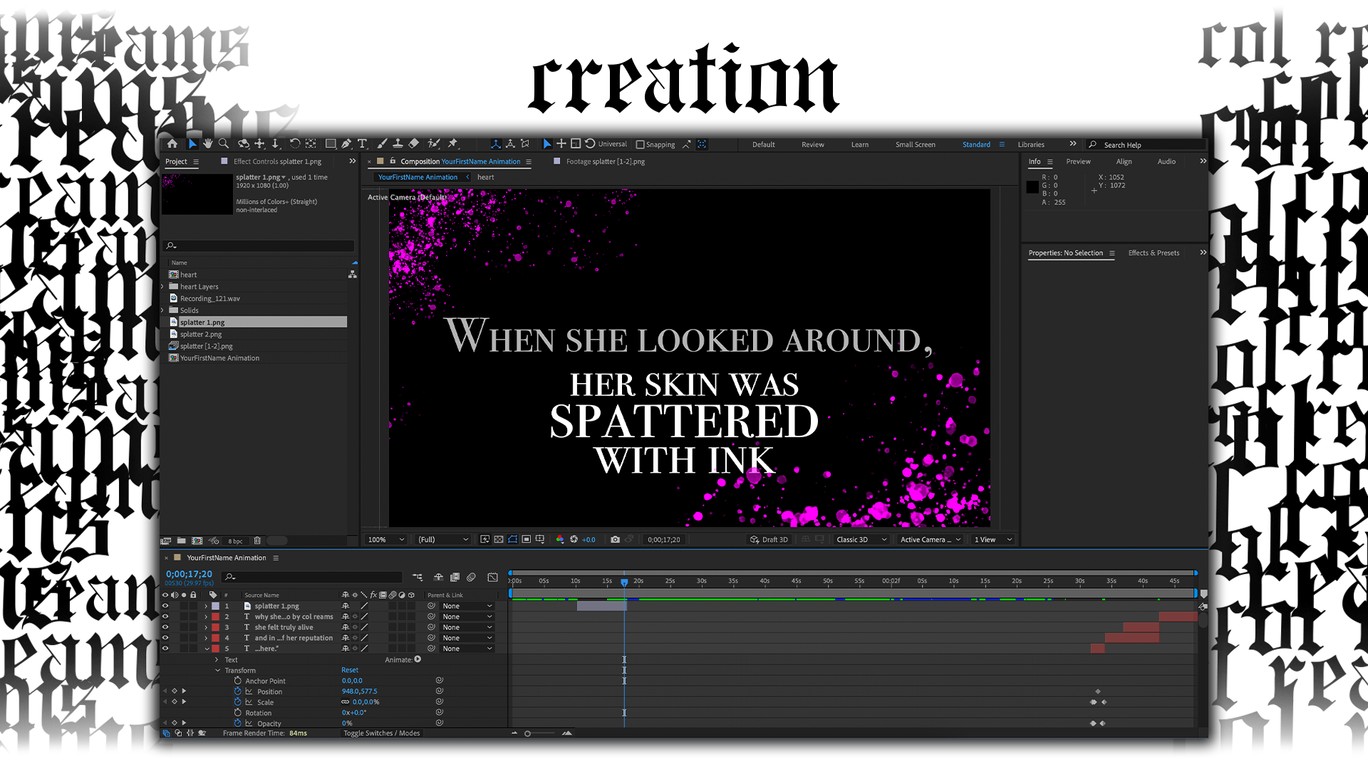 The text I typed out is the actual text I typed out. The contents of the text are not mine, of course, as that credit goes to Taylor Swift. The splatter effects used are from Photoshop brushes. I made a transparent image with the splatter and imported it into the project.